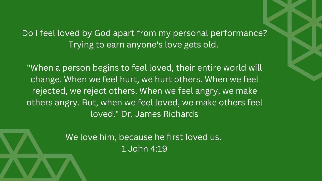 "When a person begins to feel loved, their entire world will change. When we feel hurt, we hurt others. When we feel rejected, we reject others. When we feel angry, we make others angry. But, when we feel loved, we make others feel loved." Dr. James Richards